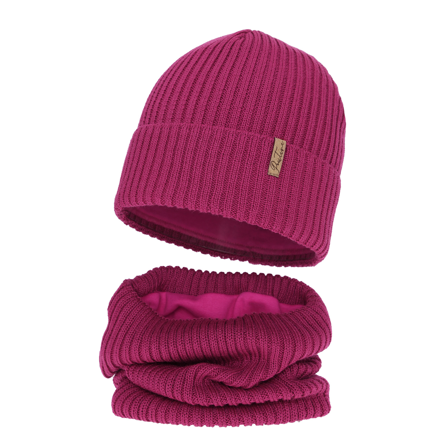 Čepice a tunel podšitý fleecovou vrstvou pro dívku zimní komplet, amarantový, s merino vlnou, Odette